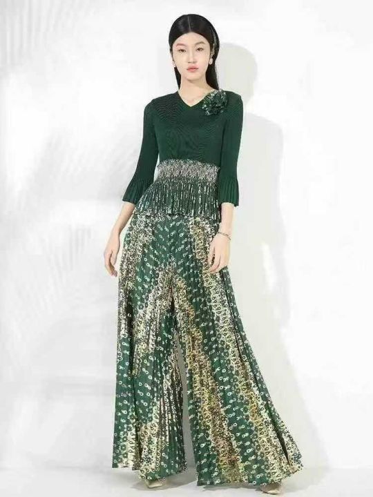 380套三宅褶皱时尚气质高端烫金v字领套头七分袖上衣高腰阔腿裤两件套,做高...