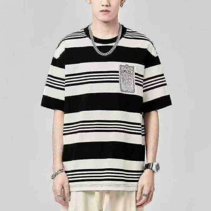 6.9清210件高街美式徽章条纹短袖t恤男夏季潮牌落肩宽松百搭休闲半袖情侣上...