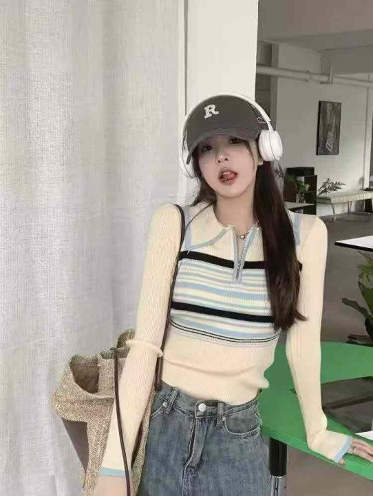 拉链polo领撞色条纹正肩长袖修身显瘦毛衣,图片款,高弹力,品质好独立包装...