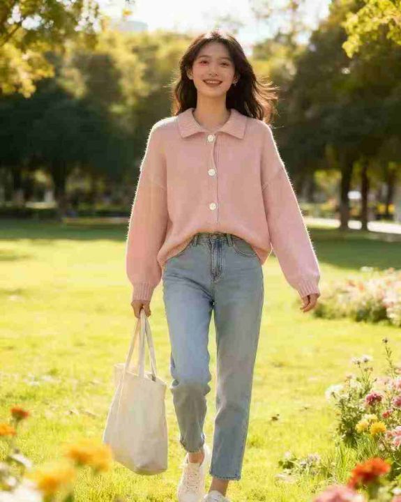 粉色翻领毛衣外套女秋冬短款宽松韩版学生甜美厚款针织开衫,单款...