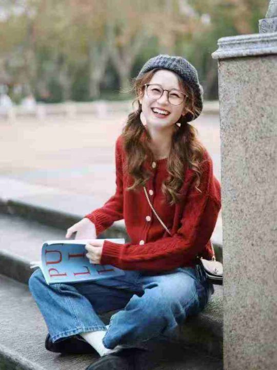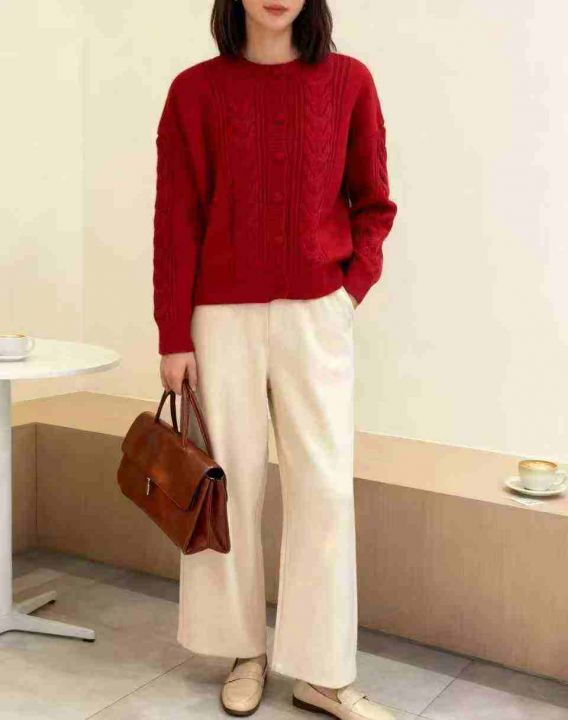 复古圣诞风红色毛衣开衫外套女秋冬加厚短款麻花针织上衣宽松外穿,...