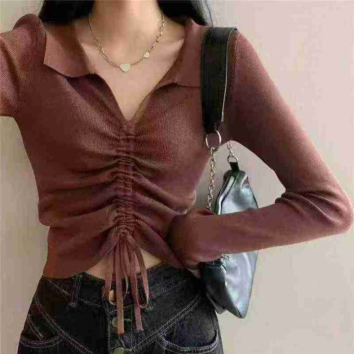 秋季新款韩版复古网红抽绳绑带设计款Polo领长袖针织套头毛衣,独立包装,均...