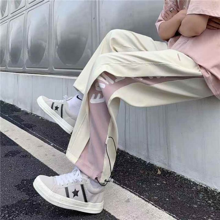 523条,港风休闲裤女2025夏季新款宽松阔腿裤薄款抽绳束脚拼接学生运动裤,...