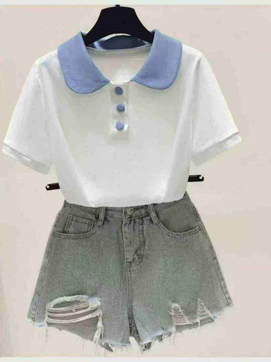 ️301件,纯棉夏季清新宽松遮肉套装女新款学院风POLO领T恤衫,独立包装,码...