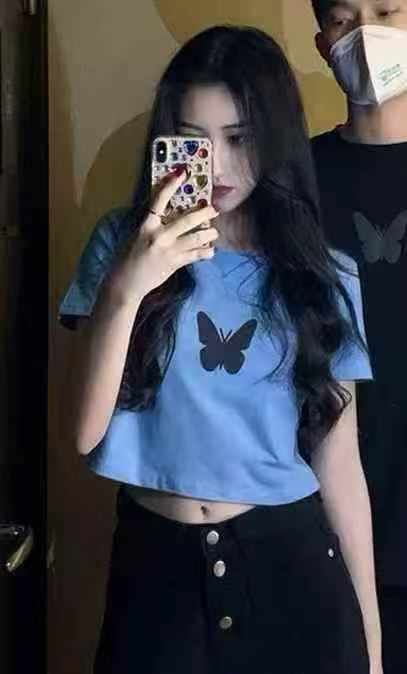 全清价5.9元蝴蝶短袖T恤女短款露脐上衣设计感小众辣妹上衣,独立包装,码数...