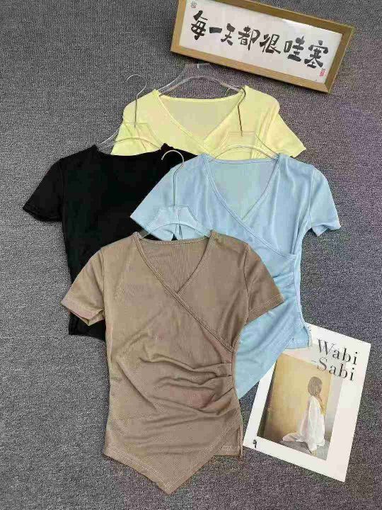 不规则冰丝短袖596件5.5面料柔软,高弹力,褶皱收腰,交叉V领设计,码数1-5...