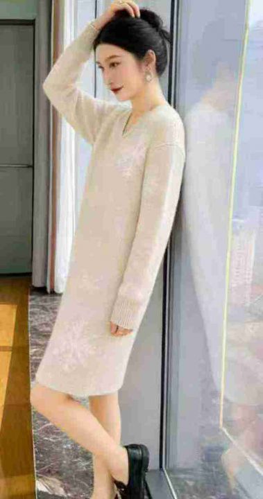 秋冬新款宽松慵懒风提花加厚北极绒V领套头毛衣连衣裙,独立包装,码数S-2XL...