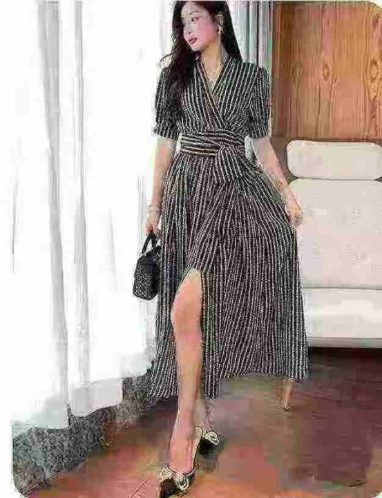 全清价9.5元复古法式印花v领显瘦短袖开叉绑带气质长连衣裙,独立包装,码数...