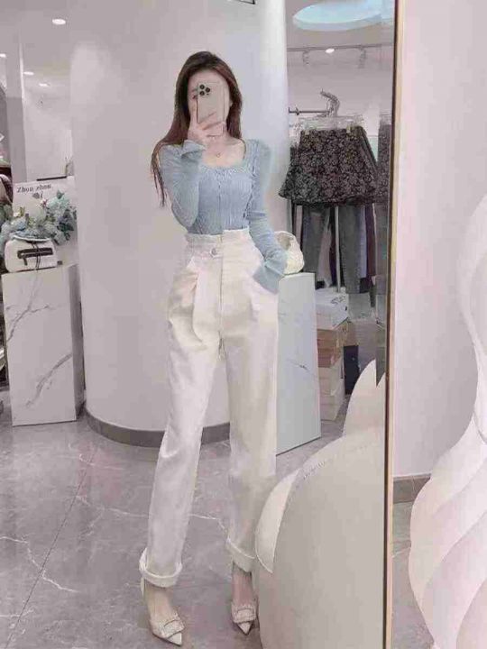 9.9清96件女水洗棉牛仔裤高级感高腰阔腿裤女春秋今年流行的长裤子 码数S-M-...