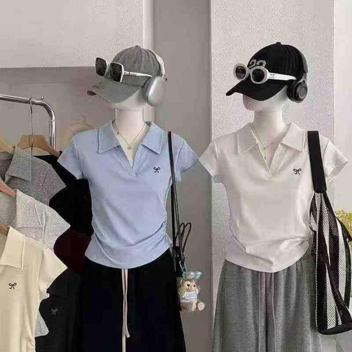 ☕️纯棉收腰polo领正肩短袖T恤女夏季甜辣妹显瘦短款刺绣V领上衣6680件全清...
