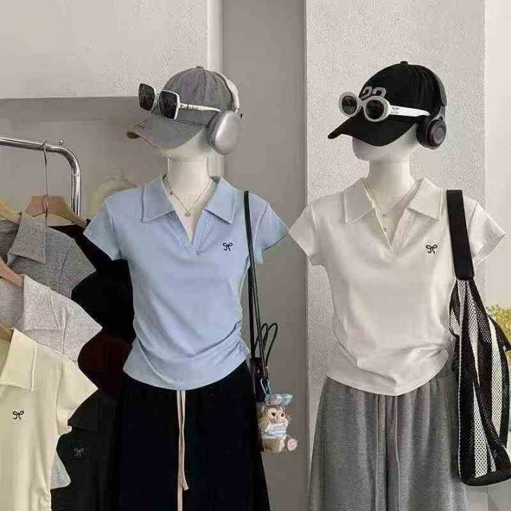 ☕️纯棉收腰polo领正肩短袖T恤女夏季甜辣妹显瘦短款刺绣V领上衣6680件全清...
