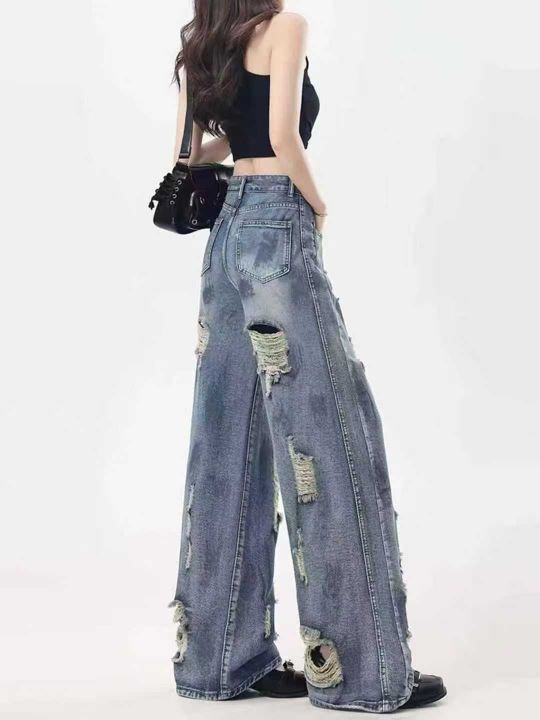 复古扎染废土风破洞女牛仔裤水洗垂感阔腿拖地裤,码数S-XXL,面料舒服柔软...