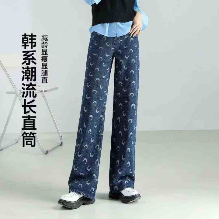 茵曼秋季新款爆款印花设计感牛仔裤洋气直筒阔腿宽松休闲裤,独立包装,S -...