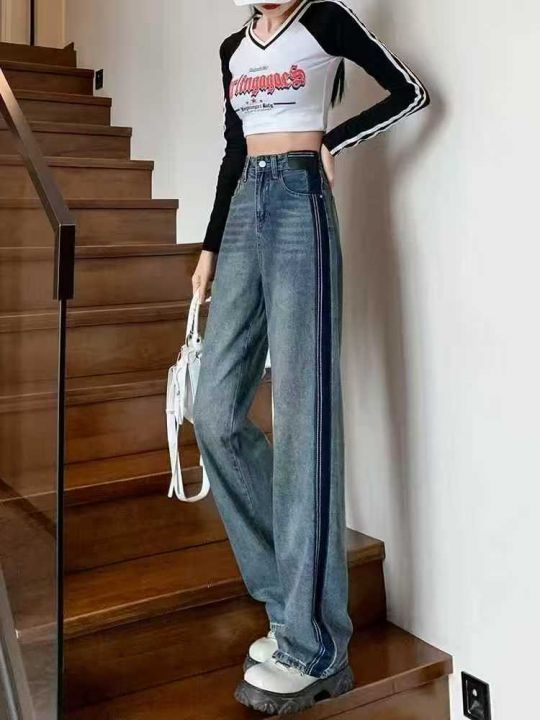259件高品质高腰直筒阔腿牛仔裤女春秋季撞色小众垂感女士软牛仔裤,面料亲...