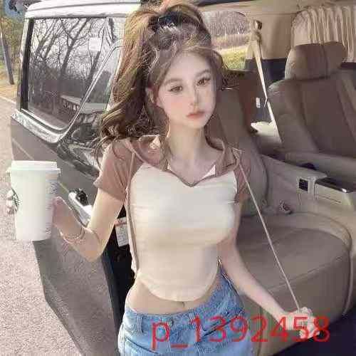 纯欲甜辣妹风撞色抽绳连帽短袖弧形不规则针织短袖,独立包装,200件,清6.5...