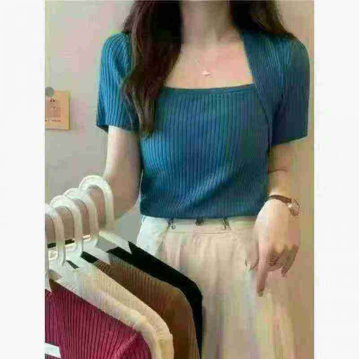 ️全清4.9 新款冰丝针织短袖t恤,靓妹夏季韩版修身显瘦,百搭假两件体恤上...