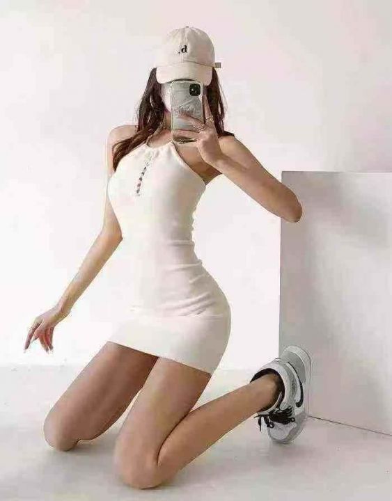 夏季新款网红性感纯欲风个性系带挂脖弹力修身针织吊带连衣裙,独立包装,均...