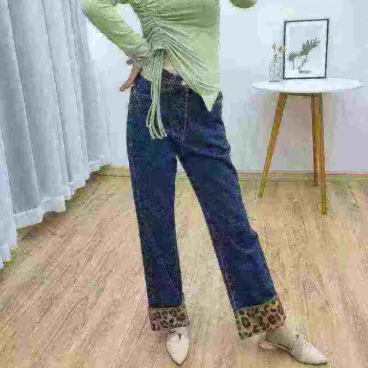 高腰牛仔直筒裤显瘦小个子加绒深蓝美式豹纹直筒烟管裤180件,独立包装带吊...
