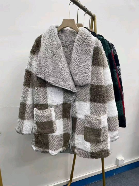 399件大翻领格纹休闲毛绒外套。图片款,面料柔软舒适保暖,品质好。S一2XL,...