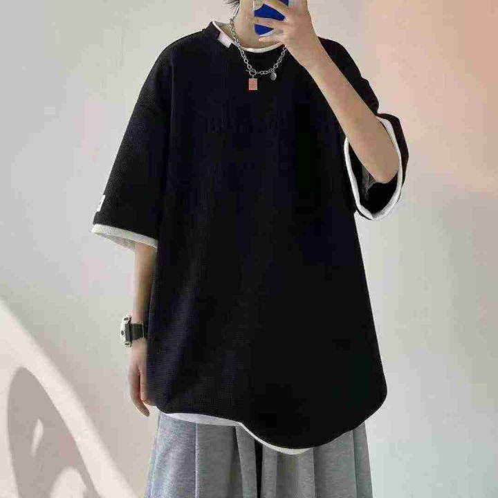 全清价5.9元假两件华夫格短袖T恤男夏季潮牌百搭ins休闲上衣港风半袖体恤,...