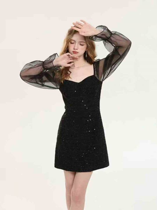 ❄️法式小礼服高端轻奢黑色小香风亮片晚宴聚会生日成人礼连衣裙女,单款单...
