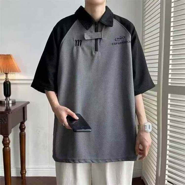 [發]男装POLO短袖980件 华夫格面料夏季美式复古撞色 宽松潮牌休闲五分短...