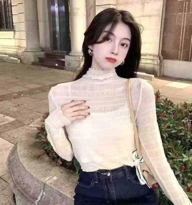 半高领网纱打底衫350件5.9,面料柔软高弹力,木耳边设计,单款5色,码数M-2...