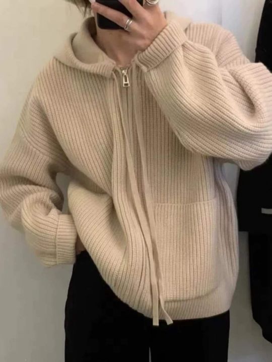 秋冬新款洋气韩版净版设计感拉链连帽毛衣开衫,独立包装,均码面料软糯舒适...