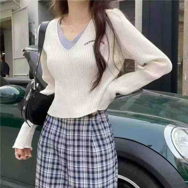 早秋新款女装假两件拼接字母刺绣长袖针织衫,独立包装,均码面料柔软舒适弹...
