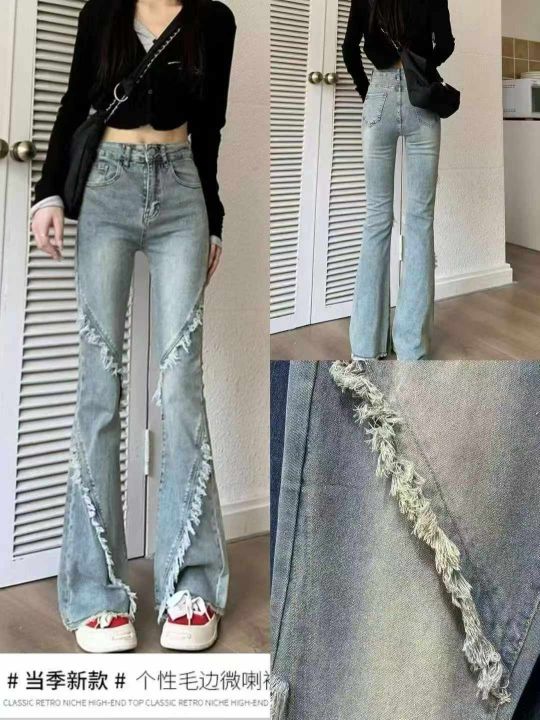 当季新款个性女装美式毛边微喇叭牛仔裤 新款裤子弹力显瘦长裤,图片两个款...