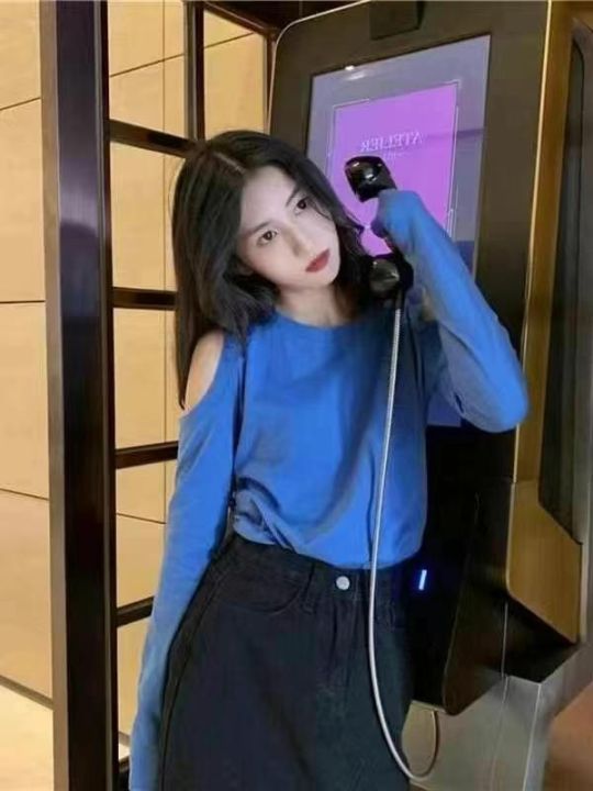 350件左右网红性感露肩长袖百搭长袖上衣,图片款,蓝色多,纯棉面料品质好...