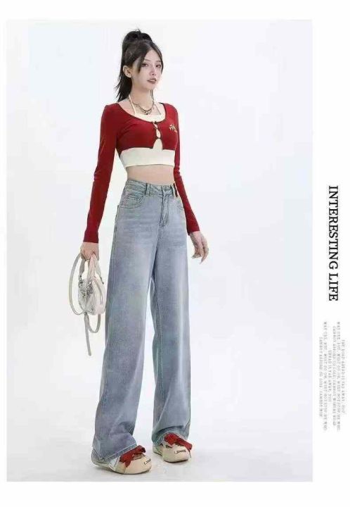 春夏新款女装可调节腰头宽松垂感直筒阔腿牛仔裤,独立包装,码数SM码(偏大...