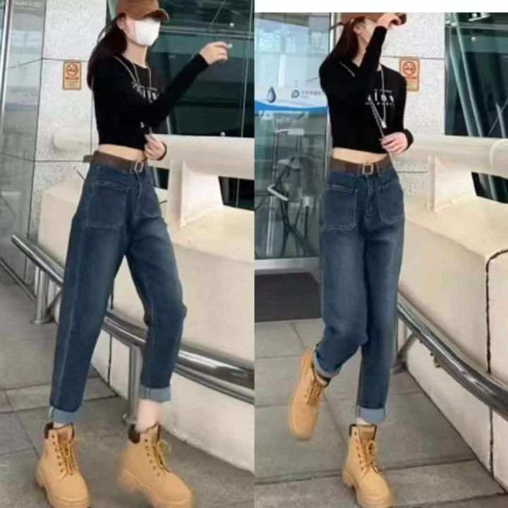 韩版哈伦女士弹力高腰百搭设计感洋气时尚老爹牛仔裤,整款3个颜色,独立包...