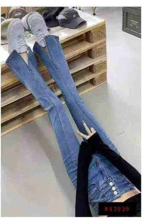 高弹力开叉牛仔裤女长裤新款高腰显瘦微喇叭裤子100条全清12.8元,码数SML,...