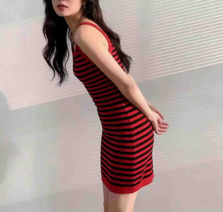 夏季新款撞色条纹韩系冰丝针织吊带连衣裙,独立包装,单款2色,均码面料柔...