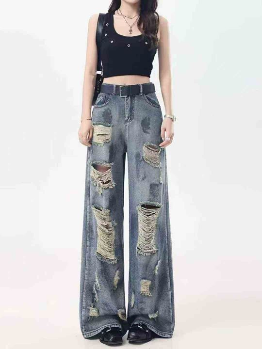 复古扎染废土风破洞女牛仔裤水洗垂感阔腿拖地裤,码数S-XXL,面料舒服柔软...