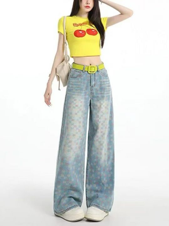 大整款棋盘格阔腿牛仔裤女夏季新款高腰宽松显瘦慵懒百搭拖地裤316条全清13....