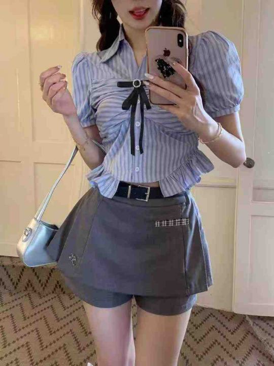 [月亮]:7.8清390件[月亮]:学院风褶皱蓝色条纹纽扣辣妹衬衫[月亮]:1234码...