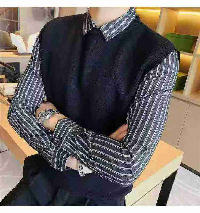 男装马甲毛衣➕衬衫两件套☕️假两件翻领毛衣男套头秋冬季修身韩版潮流休闲...