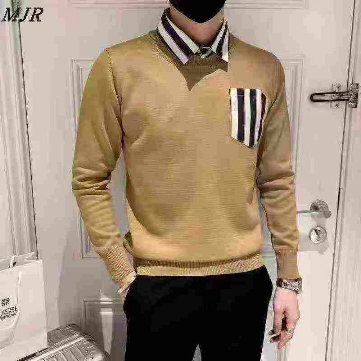 ☕️男士毛衣贴布衬衫领拼接假两件男士休闲复古毛衣英伦风针织上衣954件全...