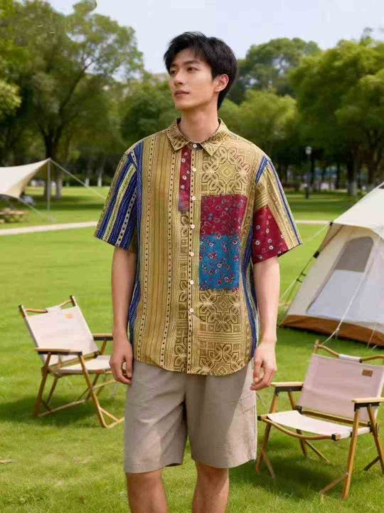 ① 夏季新款美式复古男女同款拼色设计短袖衬衣!版型宽松,整款三色,独立...