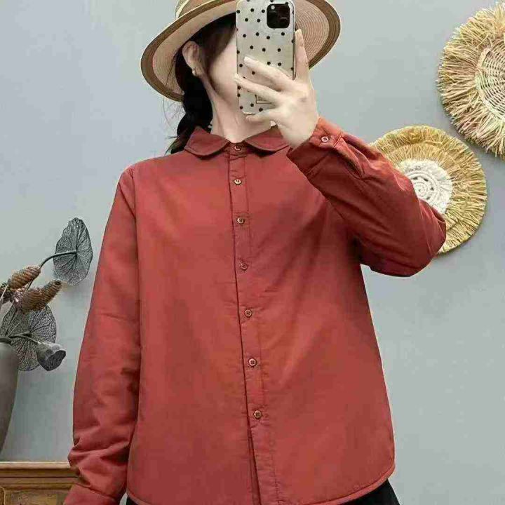 日系简约舒适加厚婴儿绒质感通勤减龄元宝领子母扣保暖长袖衬衫,面布纯棉质...