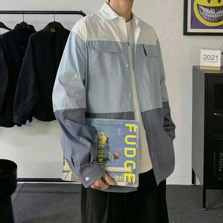 港风新款长袖衬衫126件7.5,拼接撞色,POLO领,有口袋,下摆弧形设计,码数...
