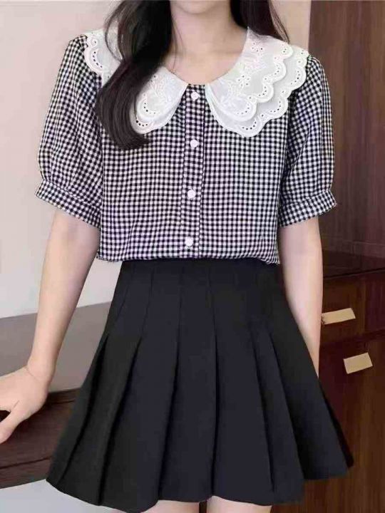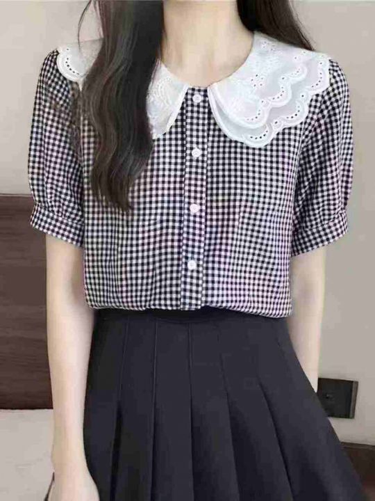☕️娃娃领短袖衬衫女夏季花边蕾丝格子衬衣宽松显瘦法式上衣220件全清7.8元...