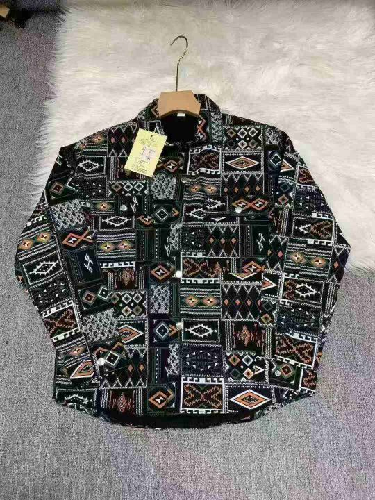 复古长袖牛仔衬衫男士春秋季新款潮牌民族风印花宽松工装休闲外套300件,独...