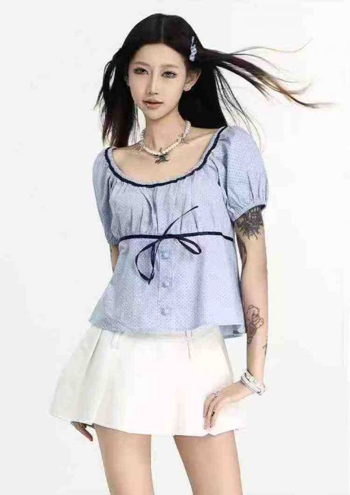 [月亮]:6.9清87件(不分货)[月亮]:甜美温柔风波点撞色辣妹衬衫上衣[月亮...
