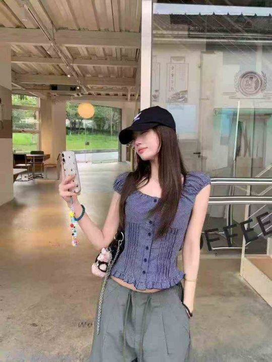 韩系复古格纹短袖衬衫187件7.9褶皱设计,荷叶边,码数1-4码,独立包装...