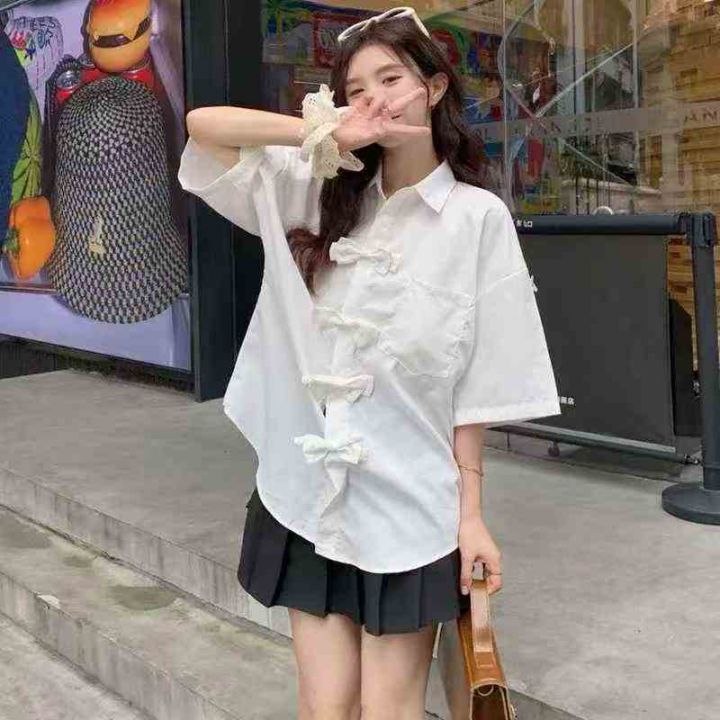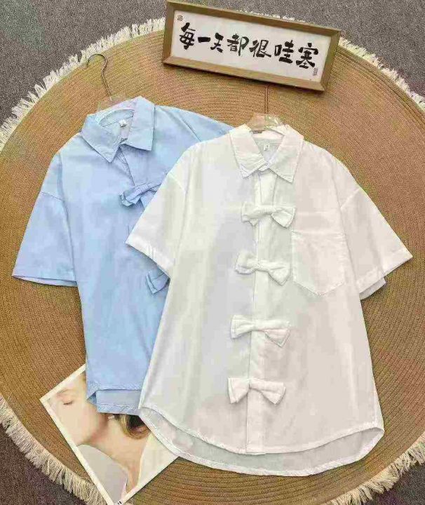 设计感休闲短袖衬衫304件7.8,蝴蝶结盘扣,宽松版,下摆弧形设计,码数1-4...