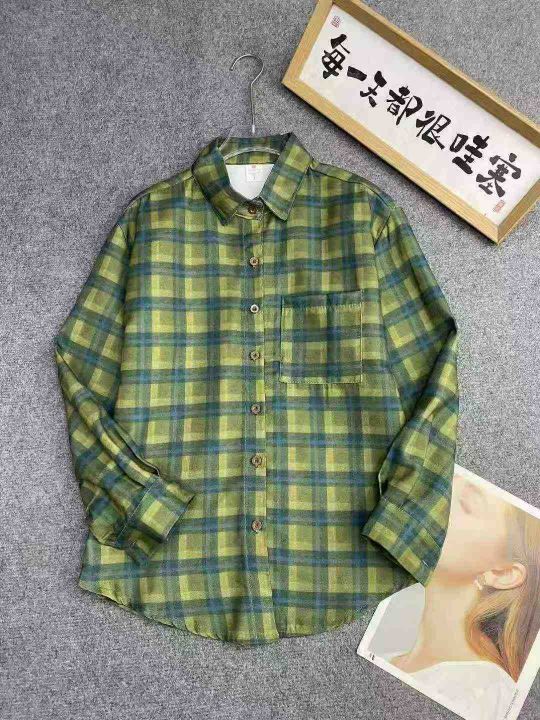 早春格子衬衫1434件,清9.5,宽松慵懒风,弧形下摆,复古绿色撞色格纹,码...