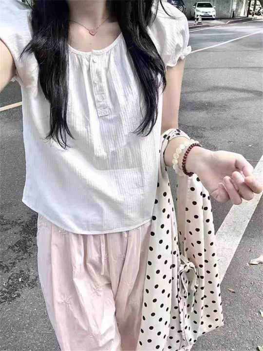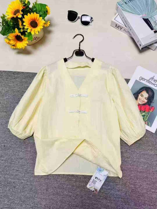 杏色短袖衬衫女夏季轻奢高级感温柔气质法式泡泡袖盘扣纯棉上衣,单款单色,...